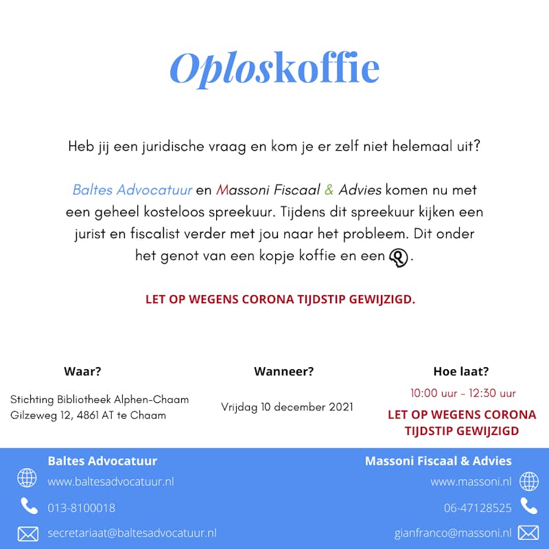 Vrijdag 10 december van 10.00 -12.30 uur is er een juridisch loket in de Bibliotheek Alphen-Chaam. Stel je vraag onder het genot van een kopje koffie.