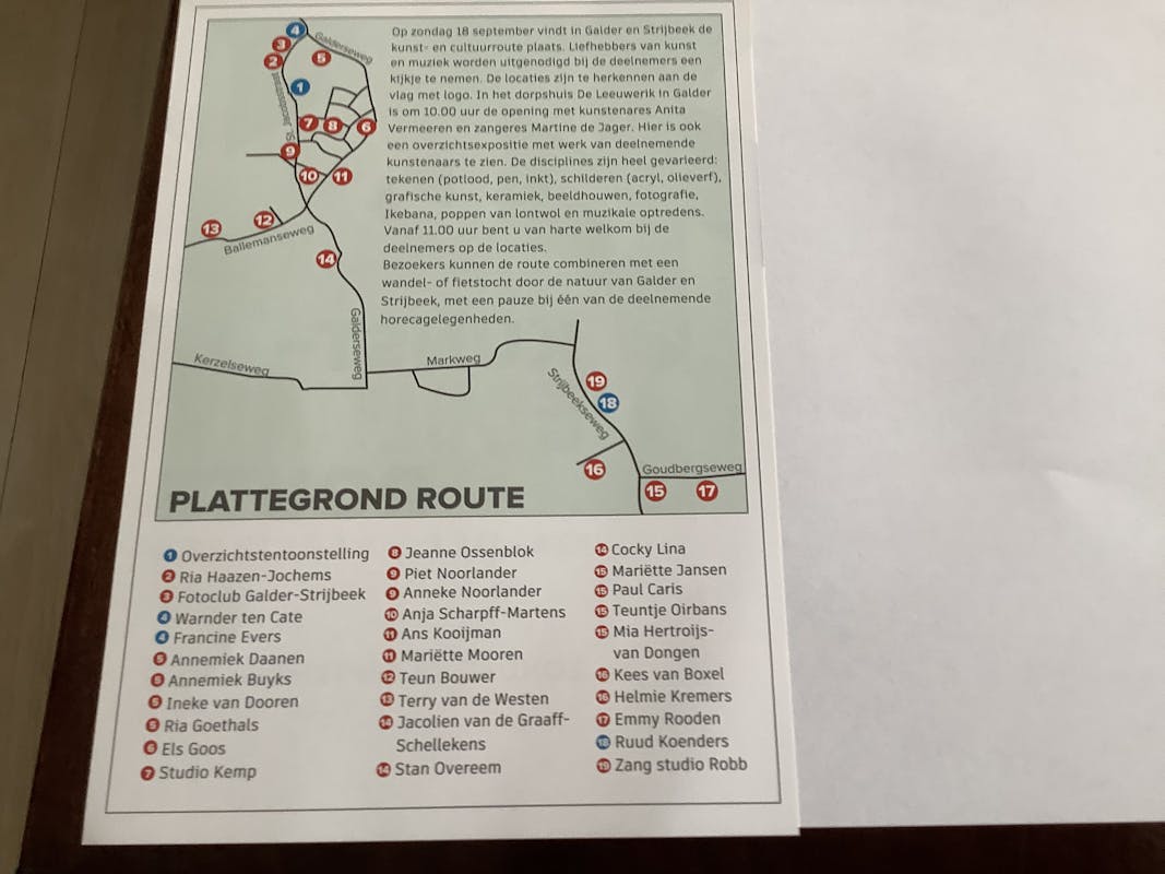 Zondag 18 september vindt de kunst- en cultuurroute Galder-Strijbeek plaats. Om 10.00 uur is er een feestelijke opening bij Dorpshuis De Leeuwerik in Galder. Daar is ook de overzichtstentoonstelling van de deelnemende kunstenaars.