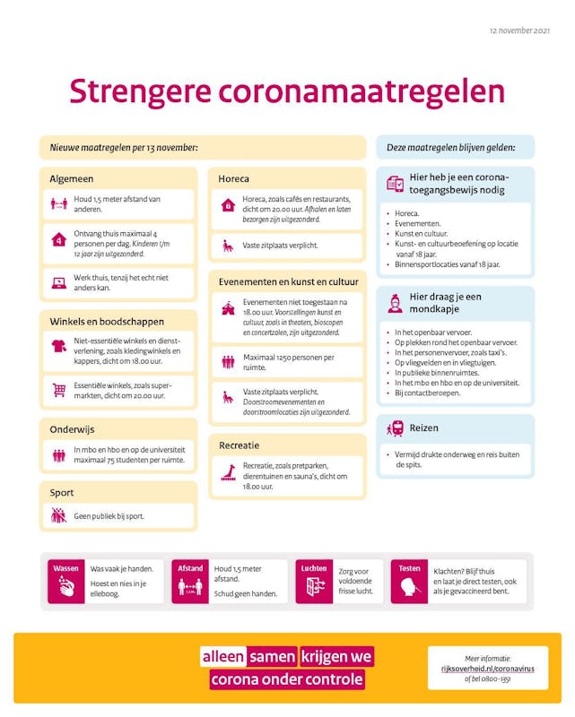 Om de stijging van het aantal besmettingen terug te dringen en verdere druk op de zorg te voorkomen, gelden per 13 november strengere maatregelen. Deze zijn erop gericht het aantal contactmomenten per dag te verminderen.