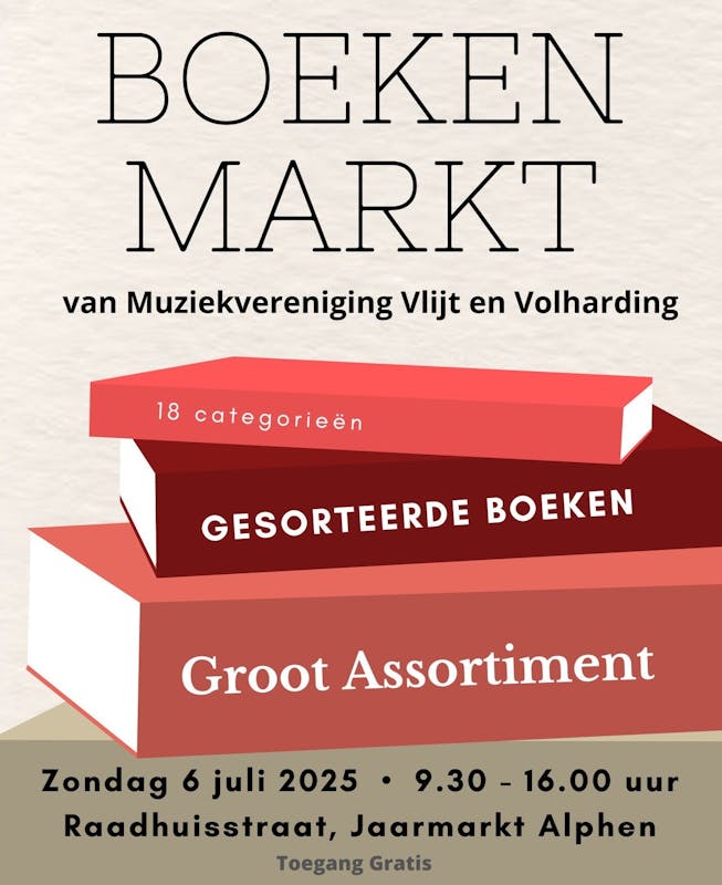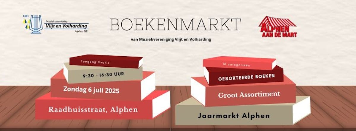 Samen bouwen we aan een liefde voor lezen, dus kom ook dit jaar naar onze Boekenmarkt bij “Alphen aan de Mart” op zondag 6 juli 2025 van 9.30 – ± 16.00 uur. De boekenstand staat aan de Raadhuisstraat in Alphen. Boeken voor mooie prijzen! Boeken worden door ons wekelijks verzameld bij het inleverpunt aan de St. Jansstraat. De aanvoer van boeken is geweldig en blijft maar groeien!. Een sorteerploeg en extra vrijwilligers sorteren de boeken in maar liefst 18 genres/categorieën. Dan worden de boeken netjes in bakken gezet, klaar voor de verkoop op de Boekenmarkt van Vlijt en Volharding bij “Alphen aan de Mart” 2025