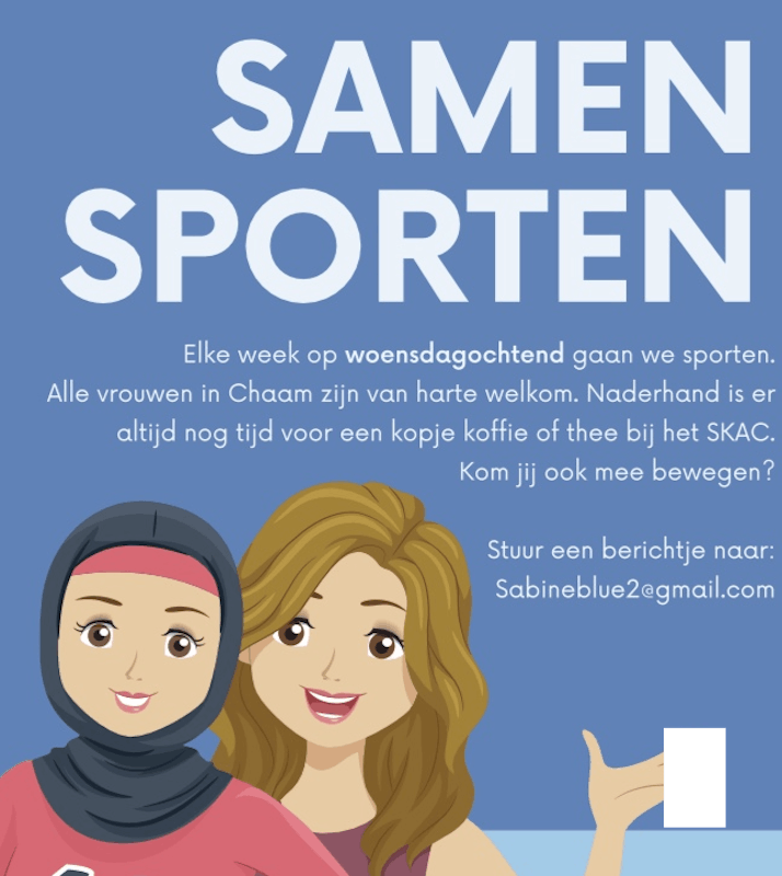 Sport & Ontmoeting Chaam is voor vrouwen die in Alphen-Chaam wonen, samen willen bewegen, maar waarvoor het gewone aanbod niet passend is. Zij sporten iedere woensdagochtend van 10.00 tot 11.00 uur in het Skac aan de Gilzeweg 12 in Chaam. Na afloop is er tijd voor een kop koffie of thee.