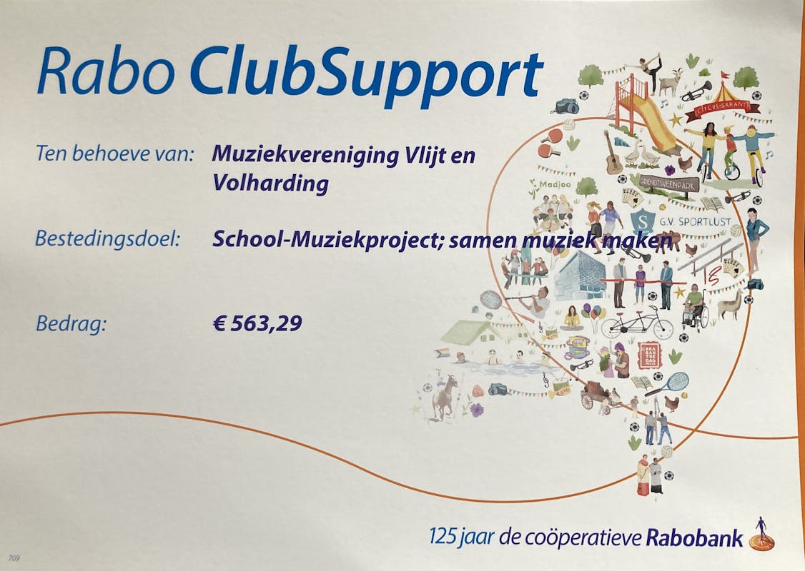 Ook Vlijt en Volharding doet mee aan de ClubSupport actie. Het bestedingsdoel dit jaar is het Muziekproject: Samen muziek maken. We starten daarmee in week 43 met een ‘bliksem-promotietoer’ op de basisschool en daarna vanaf 3 november met 10 bijeenkomsten voor belangstellende kinderen die samen muziek willen maken. Al diegenen die een stem gegeven hebben aan onze vereniging zorgen ervoor dat wij € 563,29 mogen ontvangen om te bestelden aan ons project. Bedankt voor iedereen die gestemd heeft! En dank aan Rabobank De Zuidelijke Baronie. #vlijtenvolharding #muziekmakenisleuk #samenmuziekmaken