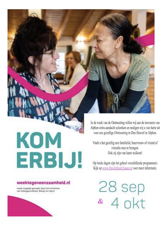 We ontmoeten je graag op donderdag 28 september en/of woensdag 4 oktober in Den Heuvel in Alphen. Door een samenwerking tussen Effe Buurten Alphen, Het Trefpunt Alphen-Chaam, Zonnebloem Alphen, Seniorenvereniging Alphen en het Dorpsteam Alphen-Chaam is deze ontmoeting mogelijk gemaakt. Je kunt alleen naar deze ontmoeting komen, maar mag ook gezellig iemand meenemen. "Hoe meer zielen hoe meer vreugd!"
