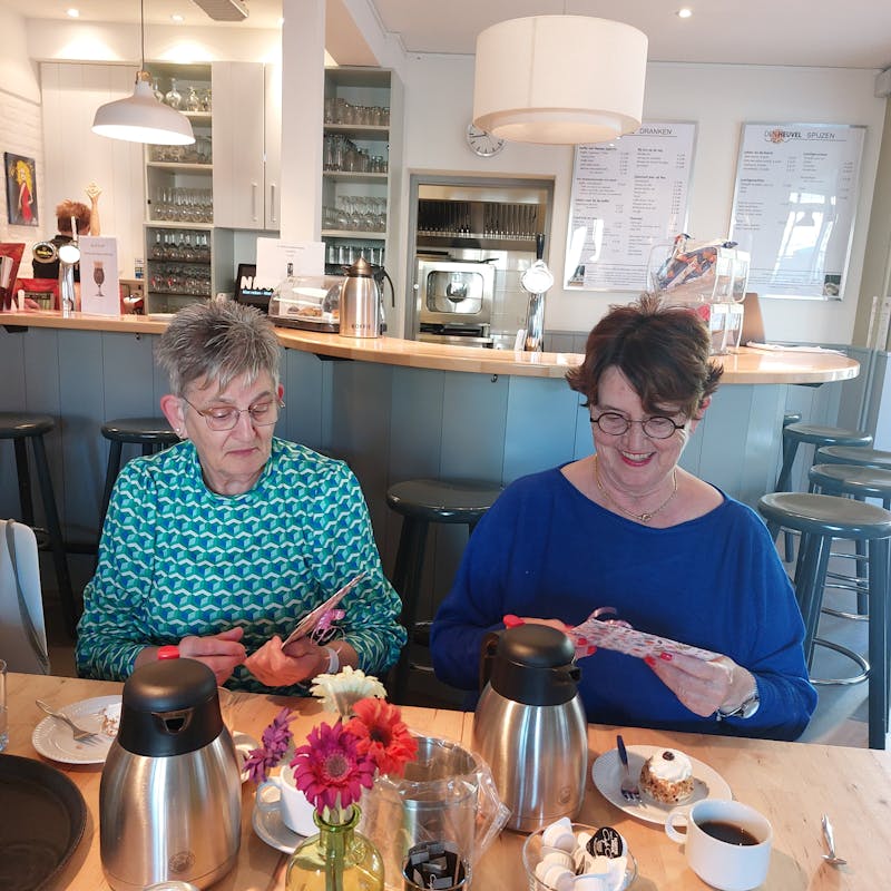 We hebben Lia en Nel een VVV-bon aangeboden voor hun altijd enthousiaste inzet bij Effe Aanschuiven iedere maand.